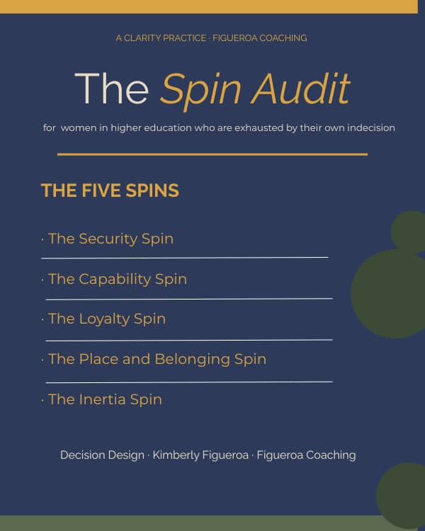 The Spin Audit is a free clarity practice for women in higher education who have been circling the same question too long. It separates what you're actually carrying — so you can think clearly about each piece instead of treating a five-part problem like one impossible thing.
